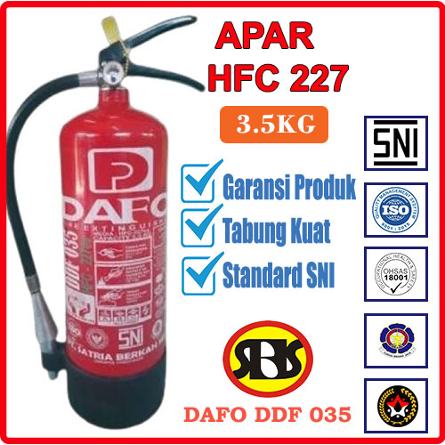 Dafo DDF 035 merupakan Alat Pemadam Kebakaran Api Ringan dengan berat 3.5 Kg media HFC-227ea beberbentuk liquid, namun ketika disemprotkan akan berubah jadi gas. APAR jenis ini sangat aman karena tidak merusak ozon meskipun berbentuk gas telah tersertifikasi SNI, PMK, ISO 9001, OHSAS aman bisa anda gunakan sebagai alat pemadam kebakaran, baik di Rumah, Kantor, Gedung, Gudang dan di Perusahaan anda.