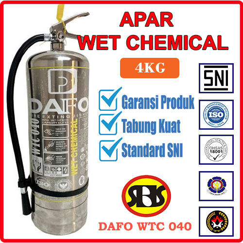 Dafo WTC 040 Wet Chemical Tabung APAR Pemadam Kebakaran 4 Kg telah tersertifikasi SNI, PMK, ISO 9001, OHSAS aman bisa anda gunakan sebagai alat pemadam kebakaran, baik di Rumah, Kantor, Gedung, Gudang dan di Perusahaan anda.